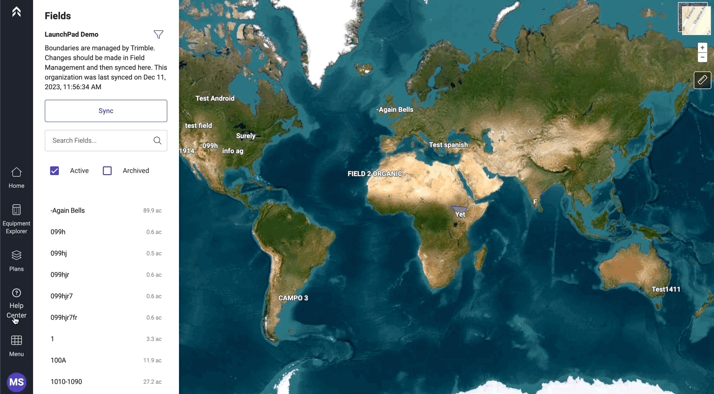 2. Click the “Sync” button in the upper left under the Organization selection drop down. This will verify that we have the most updated fields/boundary.